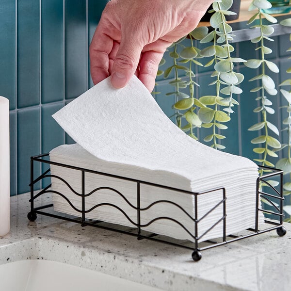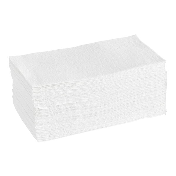 With the ability to do the work of multiple paper towels, just one Lavex linen-feel 12" x 16" white 1/6 fold guest towel is strong enough to clean up spills and soft enough to gently dry guests' hands. Perfect for restaurants, hotels, or lounges, it also comes flat packed and ready to use so you can efficiently stock restrooms and dispensers.