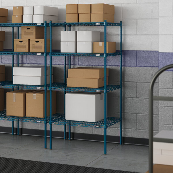 Designed for use in moist or damp environments, this shelving unit is an excellent choice for organizing and maximizing storage space. Whether you're looking to streamline your warehouse operations or simply need additional storage in your industrial facility, this heavy-duty shelving kit is the perfect solution. Mix and match with Lavex Pro accessories (sold separately) to personalize your kit! Invest in the Lavex Pro blue epoxy heavy-duty 4-shelf kit and experience the durability and functionality it brings to your workspace.