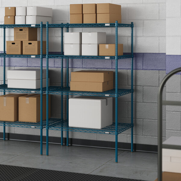 Designed for use in moist or damp environments, this shelving unit is an excellent choice for organizing and maximizing storage space. Whether you're looking to streamline your warehouse operations or simply need additional storage in your industrial facility, this heavy-duty shelving kit is the perfect solution. Mix and match with Lavex Pro accessories (sold separately) to personalize your kit! Invest in the Lavex Pro blue epoxy heavy-duty 4-shelf kit and experience the durability and functionality it brings to your workspace.