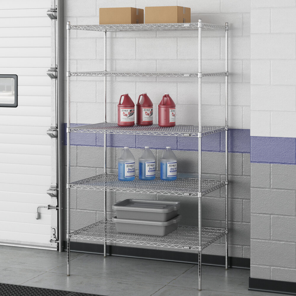Designed for use in dry environments, this shelving unit is an excellent choice for organizing and maximizing storage space. Whether you're looking to streamline your warehouse operations or simply need additional storage in your industrial facility, this heavy-duty shelving kit is the perfect solution. Mix and match with Lavex Pro accessories (sold separately) to personalize your kit! Invest in the Lavex Pro chrome heavy-duty 5-shelf kit and experience the durability and functionality it brings to your workspace.
