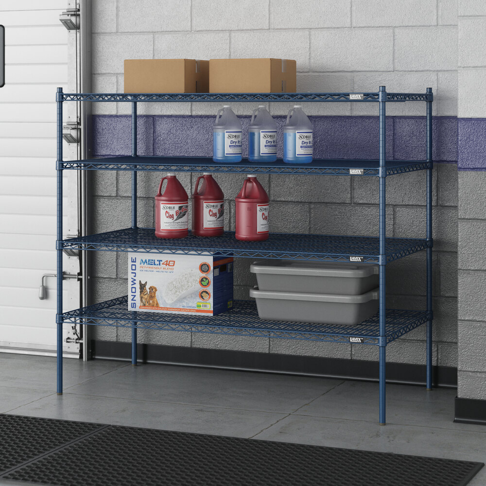 Designed for use in moist or damp environments, this shelving unit is an excellent choice for organizing and maximizing storage space. Whether you're looking to streamline your warehouse operations or simply need additional storage in your industrial facility, this heavy-duty shelving kit is the perfect solution. Mix and match with Lavex Pro accessories (sold separately) to personalize your kit! Invest in the Lavex Pro blue epoxy heavy-duty 4-shelf kit and experience the durability and functionality it brings to your workspace.