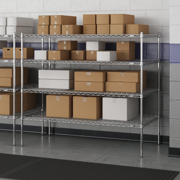 Designed for use in dry environments, this shelving unit is an excellent choice for organizing and maximizing storage space. Whether you're looking to streamline your warehouse operations or simply need additional storage in your industrial facility, this heavy-duty shelving kit is the perfect solution. Mix and match with Lavex Pro accessories (sold separately) to personalize your kit! Invest in the Lavex Pro chrome heavy-duty 4-shelf kit and experience the durability and functionality it brings to your workspace.