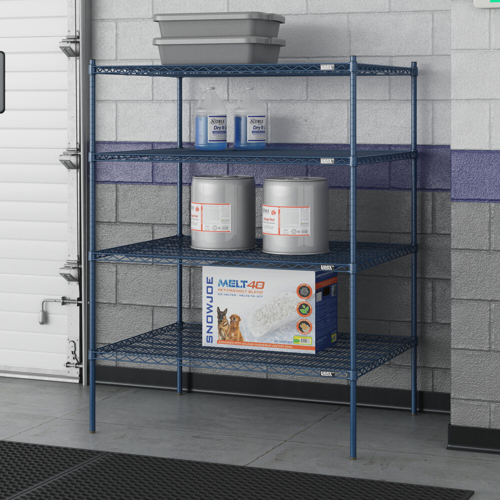 Designed for use in moist or damp environments, this shelving unit is an excellent choice for organizing and maximizing storage space. Whether you're looking to streamline your warehouse operations or simply need additional storage in your industrial facility, this heavy-duty shelving kit is the perfect solution. Mix and match with Lavex Pro accessories (sold separately) to personalize your kit! Invest in the Lavex Pro blue epoxy heavy-duty 4-shelf kit and experience the durability and functionality it brings to your workspace.