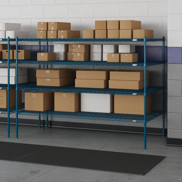 Designed for use in moist or damp environments, this shelving unit is an excellent choice for organizing and maximizing storage space. Whether you're looking to streamline your warehouse operations or simply need additional storage in your industrial facility, this heavy-duty shelving kit is the perfect solution. Mix and match with Lavex Pro accessories (sold separately) to personalize your kit! Invest in the Lavex Pro blue epoxy heavy-duty 4-shelf kit and experience the durability and functionality it brings to your workspace.
