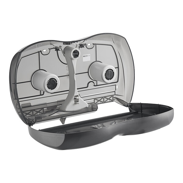 Great for commercial restrooms, this reliable dispenser is perfect for quick, convenient toilet paper dispensing. This toilet tissue dispenser features front viewing windows and transparent sides to easily keep track of the paper supply and know when it's time to refill. It’s designed with plastic teeth at the bottom to help effortlessly tear toilet paper, and its sliding mechanism ensures a complete roll is used before moving to the next.