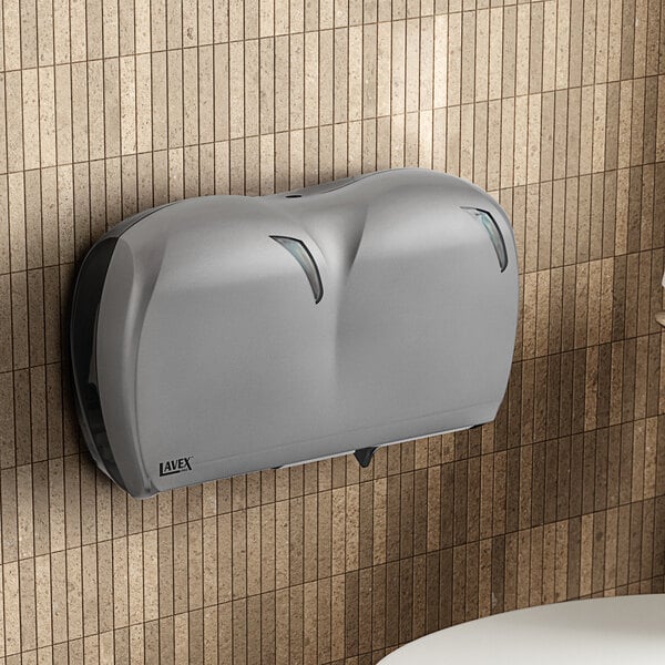 This convenient Lavex Pro titanium double-roll jumbo toilet paper dispenser is a functional, attractive addition to any commercial restroom.