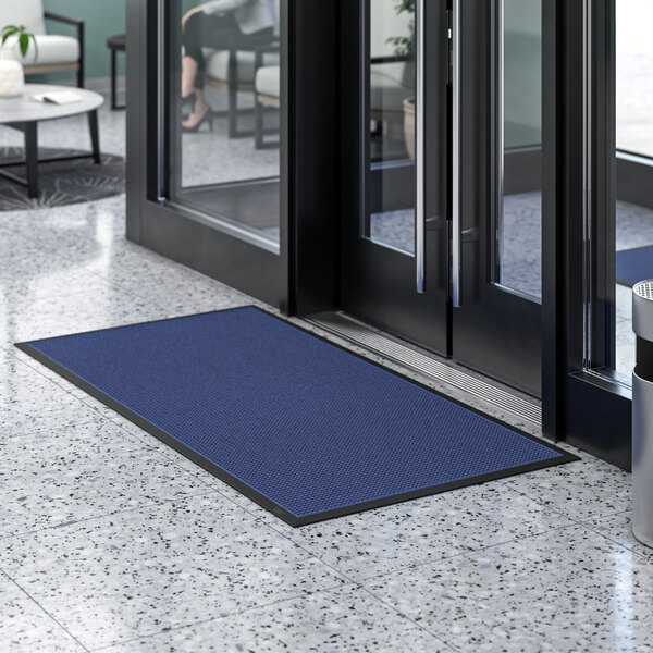 This mat is made with a blue polypropylene carpet material that resists fading, provides excellent moisture retention, and dries quickly. This mat's raised molded construction works to trap water and unsightly dirt below shoe levels, keeping it away from indoor floors.
