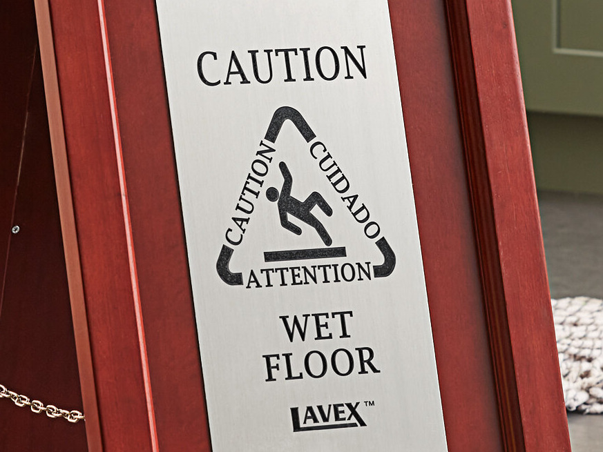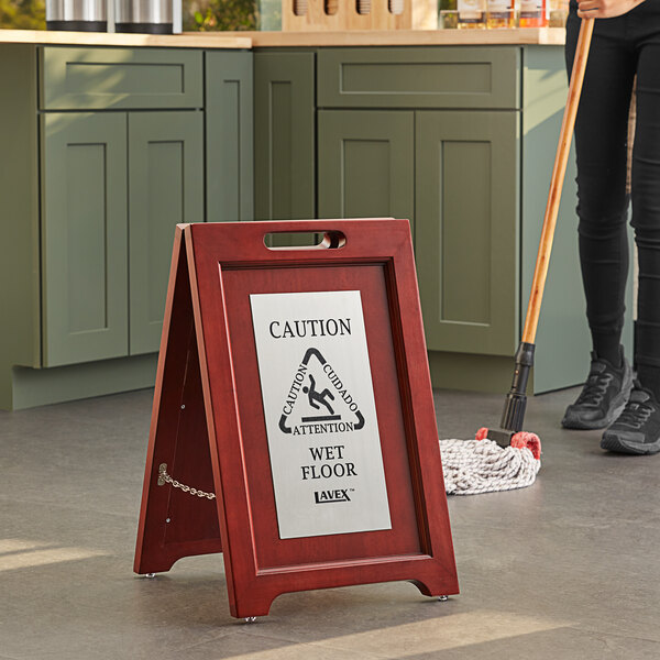 Ensure the safety of your patrons with the Lavex wood A-frame wet floor sign with stainless steel plates.