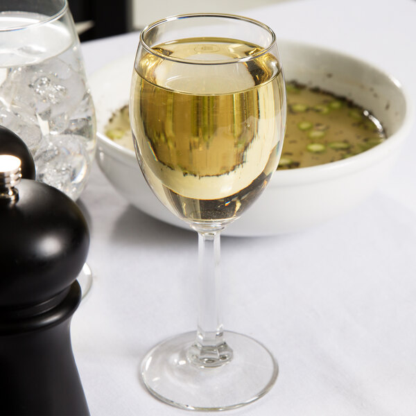 Transport your patrons to the heart of wine country with this Libbey 8764 Napa Country 7.75 oz. white wine glass. Artistically crafted to release the full potential of white wines, this glass boasts a round shape and traditional design that is sure to impress guests at your restaurant, bar, or catered event. The sleek, curved lines of the bowl serve as a unique contrast to the stem's faceted, crystal-cut look, giving this Napa Country glass a look of its own. Plus, the chip-resistant rim gives support where the glass is prone to breakage, helping to prolong its service life and cut down on replacement costs.