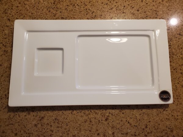 By ordering this Libbey sample, you're able to touch and see it in person to ensure it meets all the unique requirements of your foodservice space before committing to the purchase of a full case. Create tasteful table settings in your upscale dining area with this Libbey Slate tray! With a modern design that features a well ring and a large plating space, this tray is perfect for serving your signature lunch combos all on one surface. Not only does its wide rim perfectly frame each meal, but its ultra bright white color also creates optimal contrast, allowing your colorful foods to seemingly pop off the table for an eye-catching appearance.