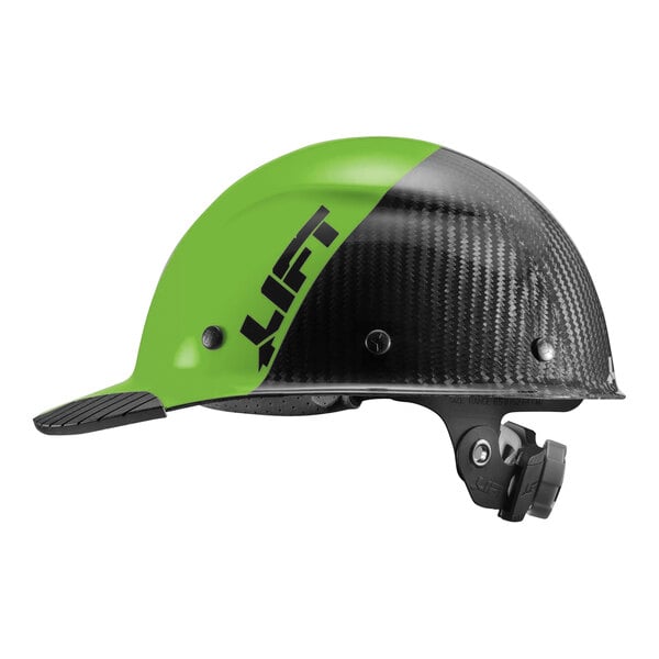 Ensure the protection of your employees with this Lift Safety Dax Fifty50 lime green / black carbon fiber cap brim hard hat. Featuring a carbon fiber-reinforced resin shell and a triple-reinforced crown, this hard hat offers impact protection while maintaining a lightweight design. The carbon fiber-reinforced polymers are strong, stiff, and durable enough for long-term use. Constructed for long-term use, this hard hat is made of a Clarino perforated synthetic leather comfort dome with a molded EVA foam insert that provides shock absorption for enhanced protection. It is ideal for welding, steel and smelting, general manufacturing, construction, open-pit mining, and petrochemical applications. Designed with comfort in mind, the shell provides heat protection in temperatures up to 350 degrees Fahrenheit. Coming with a moisture-wicking foam-backed microfiber liner and a synthetic leather brow pad, this hard hat reduces sweat buildup, helping keep employees cool during long shifts.