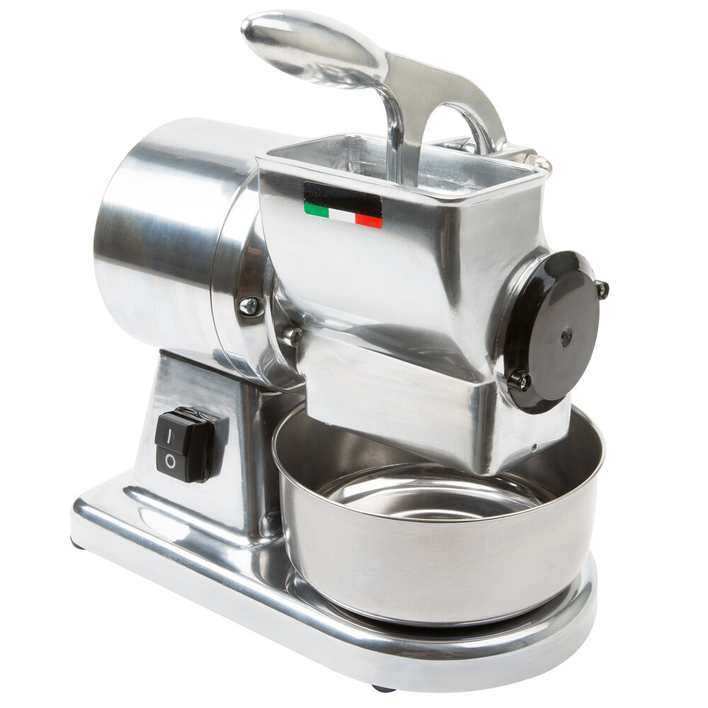 Ideal for use in a low-volume setting, this stainless steel, electric cheese grater is designed to grate hard cheese and breads for small, quick applications. With a 1/2 horsepower motor that provides 1440 RPM, this 110V electric cheese grater will get the job done quickly and efficiently. Simply cut the crust off of your harder cheeses and breads and begin grating!