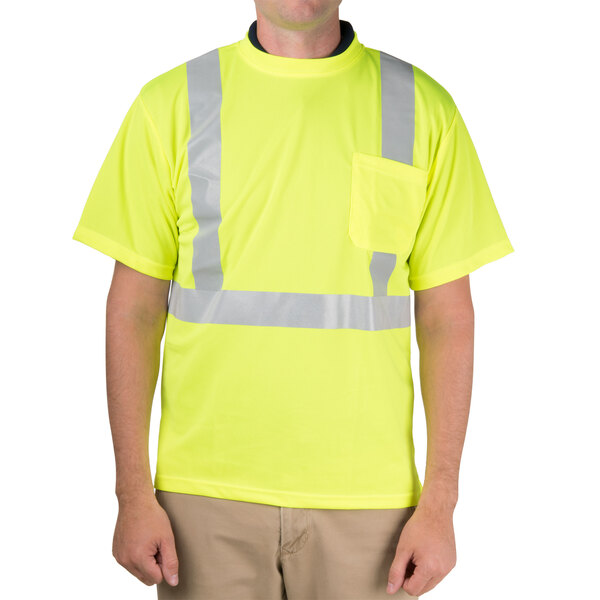 Ships free withThis lime Class II mesh short sleeve high visibility safety shirt with reflective tape is the ideal safety attire for construction and warehouse workers, parking-lot attendants, crossing guards, and maintenance crews. Designed to draw attention to the individual wearing it, this shirt's bright, eye-catching lime color ensures superior visibility for increased safety while working. The incorporated 2" thick tape also allows light to be reflected back on vehicles, motorized equipment, and their operators, helping to minimize potential danger.