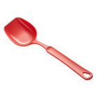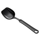 Love this spoon! The flat edge is perfect for covering a large area of the pan while stirring, keeping food from sticking. The scoop shape in the spoon makes it a perfect serving spoon for dishing up salads, sloppy Joes, etc. The serving size is perfect! The high heat tolerance is also fabulous! The price was also great, although shipping cost was high.