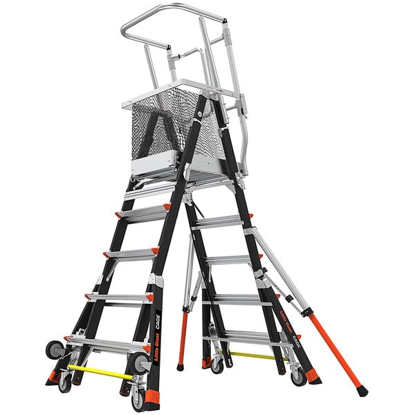 Get the job done with this safe, versatile, and lightweight Little Giant 5' - 9' Type 1AA fiberglass adjustable safety cage with wheel lift 18509-240. This unit includes a fully enclosed platform that complies with industry tie off rules, allowing workers to work at elevated heights without having to tie off. The fiberglass construction is non-conductive for safe use around electricity, and it is lightweight to work on upper floors and stages with weight limits. It easily adjusts to multiple heights using the durable cast aluminum Rock Lock adjusters. Once finished, the descent control rope brake system ensures a controlled lowering of the ladder sections. To accommodate a variety of body types, this safety cage is type 1AA rated with a 375 lb. capacity.
