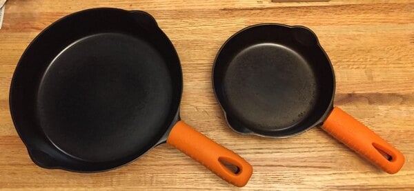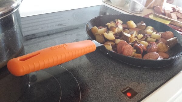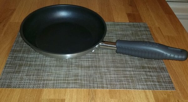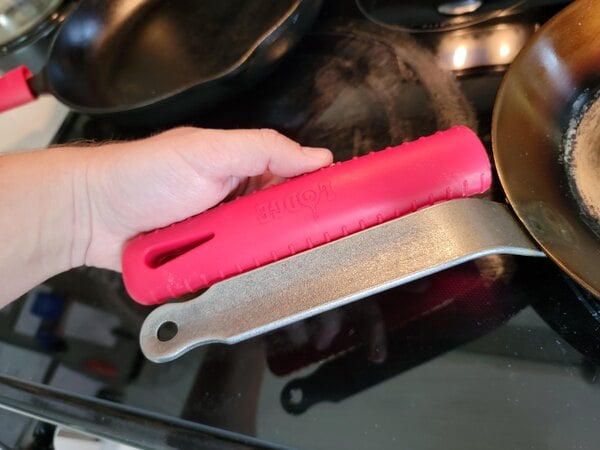 Good product. Grips my Matfer 9.5" CS pan really well. Only thing I don't like is that it is slightly oversized for the 9.5" Matfer, since it goes down over the handle bend a little. That is not a fault of the product, more just that it isn't exactly made for that handle.