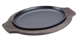 Restaurant quality oval skillet. Perfect for cooking steaks, stuffed jalapenos and all manner of meats and veggies! I use it in my outdoor pizza oven and it heats up and cooks food beautifully both inside and out!!! I love the sizzle it provides! Paired with the wooden oval base it makes for a great presentation on the dinner table! Highly recommend!