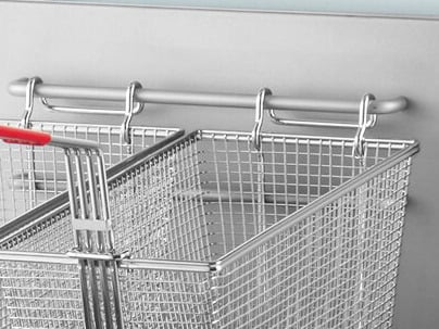 The convenient basket rails allow for quick removal from the fryer tank to drain away excess oil. They also allow you to hang the baskets at two different heights, which comes in handy when using one basket to collect items being fried with the other.