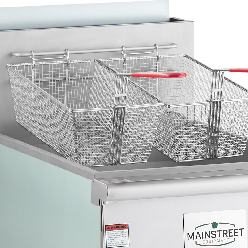 Two wire mesh fry baskets allow you to cook different products simultaneously, while the red coated handles ensure heat protection and operator comfort. This feature provides you with maximum flexibility so you can cook fries in one basket and mac and cheese bites in the other. Additionally, you could designate a particular basket for frying allergenic foods to avoid cross contamination.