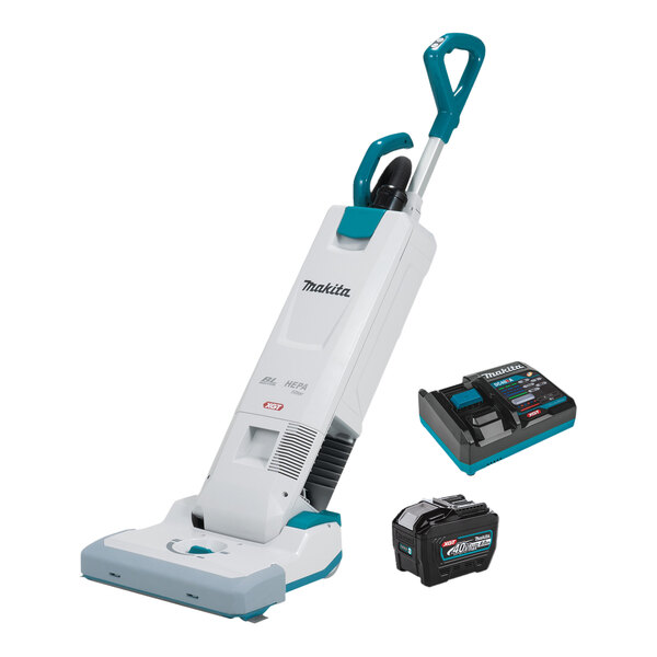 This unit operates using an efficient 40V max XGT 8.0 Ah lithium-ion battery. When fully charged, this battery provides a continuous runtime of up to 160 minutes on the low setting and 40 minutes on the high setting. Plus, it reaches full charge in only 76 minutes or less. The XGT battery delivers more constant power for high-current demands and features rigid rails with an impact-resistant construction. The XGT charger cools the battery for faster charging and features a digital display with battery charge level. It is protected against overload, over-discharge, and overheating. This vacuum is only for use with Makita batteries and chargers.