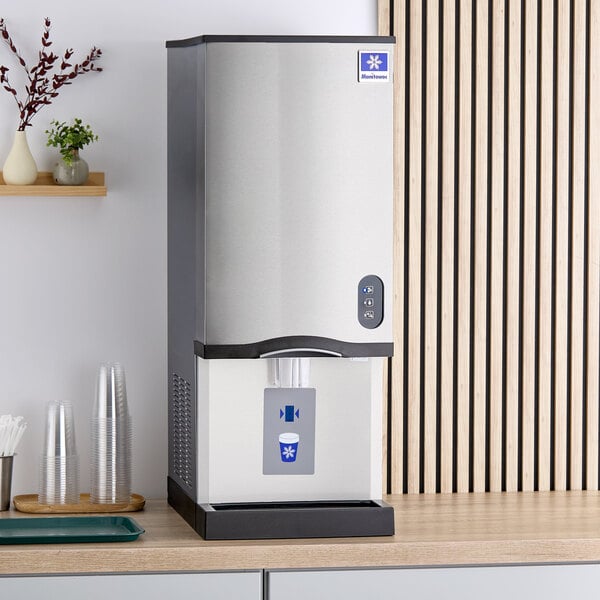 The Manitowoc countertop ice machine and water dispenser can produce up to 285 lb. of bite-sized, chewable nugget ice per day in a convenient, space-saving design! For easy use, this unit has a hands-free, automatic sensor dispensing system that is illuminated by a blue LED light for excellent visibility and aesthetic appeal. It boasts a 20 lb. storage capacity in a narrow 16 1/4" wide footprint with drain connection at the back of the unit and optional bottom drain connection for flush mounting, allowing you to keep plenty of ice ready for busy times without sacrificing valuable countertop space.