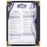 Protect your menu and create a polished presentation with this classic Menu Solutions RS33BA BK GLD Royal 4 1/4" X 11" single panel / two view black menu board with gold corners. Made of durable, stitched black leatherette, this menu board is water-resistant and easy-to-clean, making it great for constant use at your restaurant, hotel, country club, cafe, or catered event. Elegant gold metal corners accent your menu and draw your guests' eyes to your food selection and advertised specials.