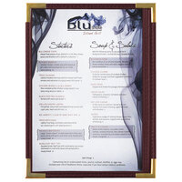 Protect your menu and create a polished presentation with this classic Menu Solutions RS33D GLD Royal 8 1/2" X 14" single panel / two view burgundy menu board with gold corners. Made of durable, stitched burgundy leatherette, this menu board is water-resistant and easy-to-clean, making it great for constant use at your restaurant, hotel, country club, cafe, or catered event. Elegant gold metal corners accent your menu and draw your guests' eyes to your food selection and advertised specials.