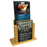 Bring some style and flair to your tabletop presentation with this Menu Solutions WDAFR-A country oak wood menu holder / tent. The back of the holder boasts a 1/16" slit in the wooden base that easily holds laminated menus, wine lists, or drink menus. This sleek menu holder features an attractive country oak color and an easy-to-clean wooden surface. It's great for contemporary restaurants and bars as it easily displays menus and specials at your tabletops or bars without taking up a lot of space.