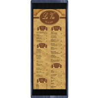 Bring a modern look to your establishment with this Menu Solutions WDSTR-A denim 5 1/2" x 8 1/2" wood menu board with top and bottom strips! Black leatherette top and bottom strips hold paper in place while making it easy to switch out sheets of paper as guests come and go, menus change, and specials rotate. This sleek menu holder features an attractive denim finish and a durable wood design. It's great for restaurants and bars, and is perfect for presenting menus, wine lists, and daily specials with ease.