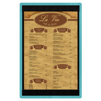 Bring a modern look to your establishment with this Menu Solutions WDSTR-BD sky blue 4 1/4" x 14" wood menu board with top and bottom strips! Black leatherette top and bottom strips hold paper in place while making it easy to switch out sheets of paper as guests come and go, menus change, and specials rotate. This sleek menu holder features an attractive sky blue finish and a durable wood design. It's great for restaurants and bars, and is perfect for presenting menus, wine lists, and daily specials with ease.