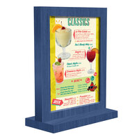 Bring some style and flair to your tabletop presentation with this Menu Solutions WTFR-A-2S true blue framed wood menu tent. The angled base ensures the tent remains upright while also adding a subtle flair to the framed design. This sleek menu tent features an attractive true blue color and an easy-to-clean wooden surface. It's great for contemporary restaurants and bars, and is perfect for presenting menus, wine lists, and daily specials with ease.
