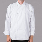Provide your chefs with this size 4X Mercer Culinary Genesis® unisex lightweight white customizable long sleeve chef jacket with cloth knot buttons to keep them looking their best in your restaurant or bistro kitchen! Made from a 65/35 cotton-poly blend twill, this jacket is comfortable and lightweight to keep your staff cool as they cook. It also boasts twin needling on the seams and bar tacking, guaranteeing it's durable enough to stand up to any foodservice environment. In addition, each garment has a design which gives it a professional and timeless look, and two inside collar buttons to keep the neck line fastened without constricting the wearer's movement.