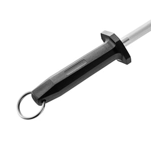 I have been using this honing/sharpening steel for over 7 years now, and it's performed great and held up very well. Honestly I like it better than my old Wusthoff. Take a close look at the handle and you'll see it's grippy and comfortable, and has a big protective barrier to keep your blade away from your hands so that you can work fast and not worry about slipping. Plus it has a ring for hanging, and comes in a 12" length. I'm helping somebody set up her kitchen and am recommending this steel BOTH for its performance and its value.