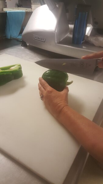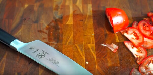 Great knife. Easy to cut with and even fits people that have smaller hands. Works great cutting all different food products in our kitchen. Will order more because the quality is there