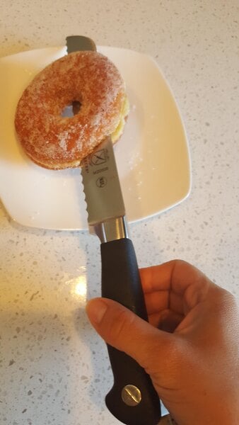 This mercer bread knife is so cheap and great to have in the chef's tool box. We do a lot of crostini's at my hotel in banquet, so it gets old using the companies knives to slice 10 baguettes at a time. This knife glides through the product and is worth every penny!