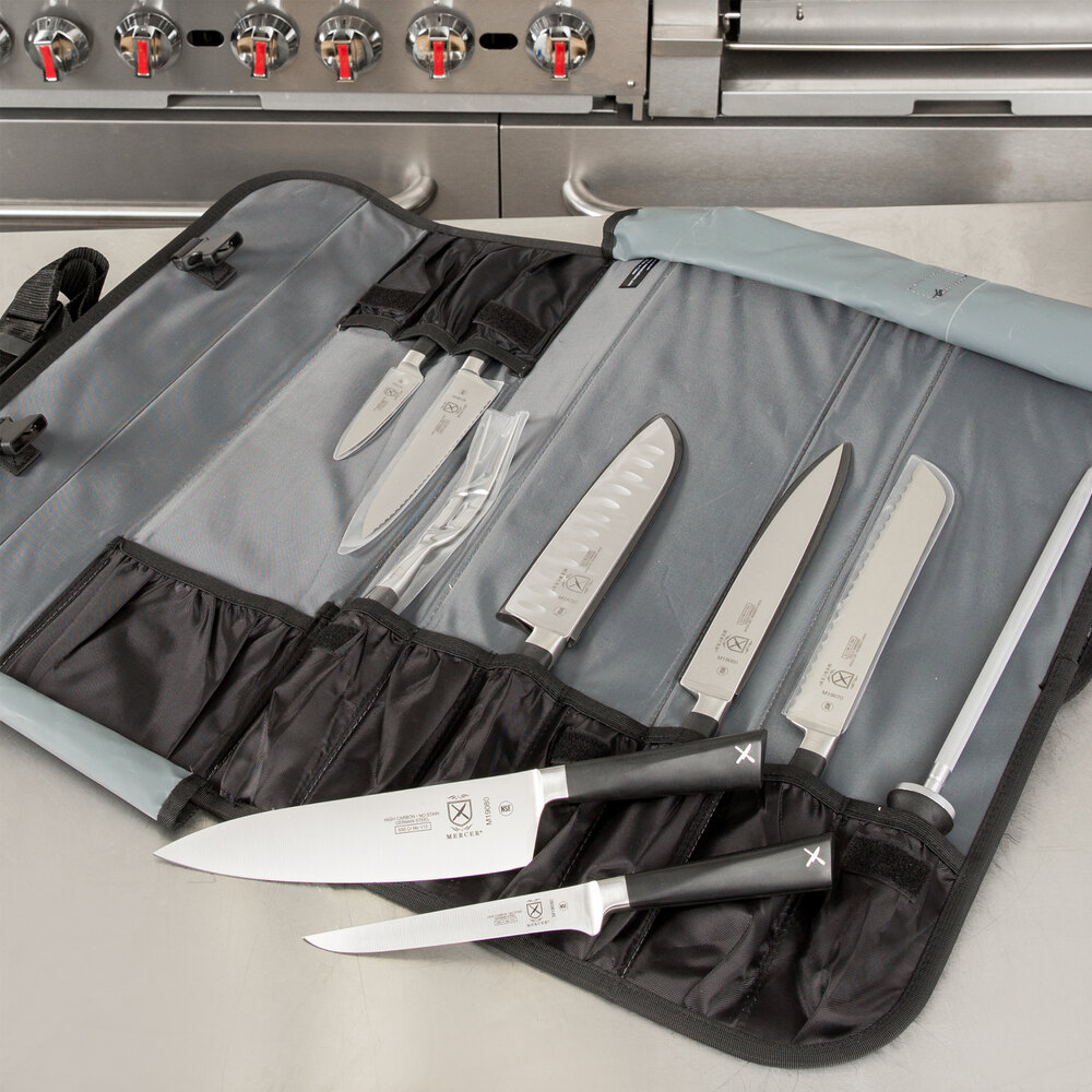 Designed for the elite kitchen professional, this Mercer Culinary M21840 ZüM® 10-piece knife case set comes with everything a great chef needs for the perfect performance. Each piece is housed in the heavy-duty case for safe, secure storage and transport in one simple package. Featuring 7 different knives, a carving fork, a sharpening steel, and a sturdy nylon storage roll, this set makes food preparation easy and efficient!