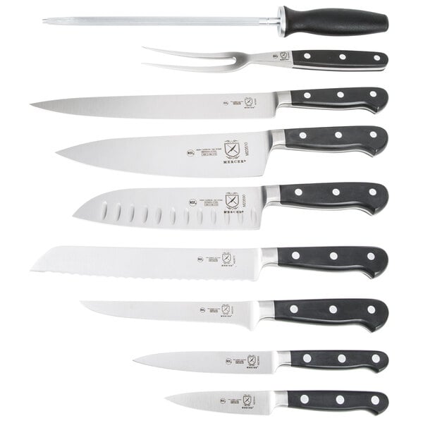 Each blade is made from high carbon, no-stain steel that is guaranteed for life. A 10" sharpening steel is included with the set, allowing for easy edge maintenance. Plus, the set comes with a paring, utility, boning, santoku granton edge, bread, chef, and carving knife, and a carving fork.