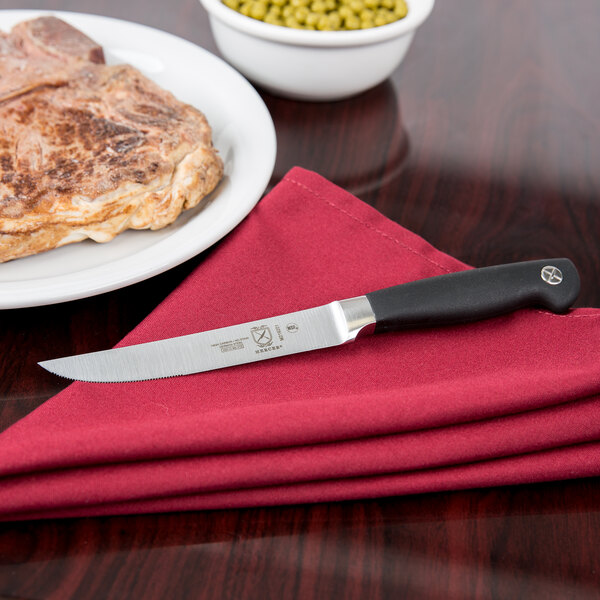 This Mercer Culinary M21920 Genesis® 7 piece forged steak knife set makes it easy to keep your knives together while maintaining a safe, organized storage solution. It includes 6 serrated steak knives and a professional storage roll, for your convenience. Use it at your restaurant, catered events, dinner parties, and receptions. The sharp blades effortlessly cut through steak for optimum results, every time.