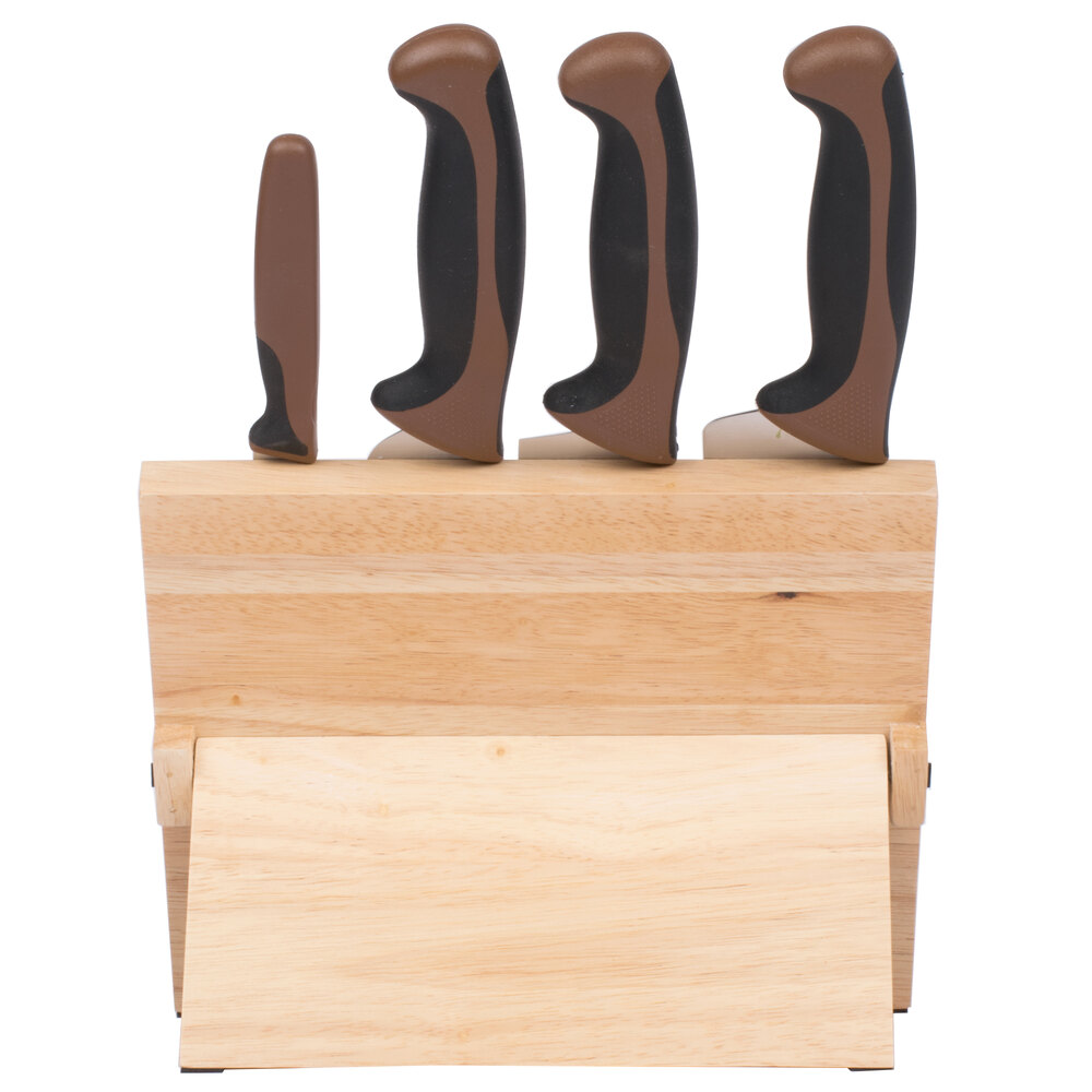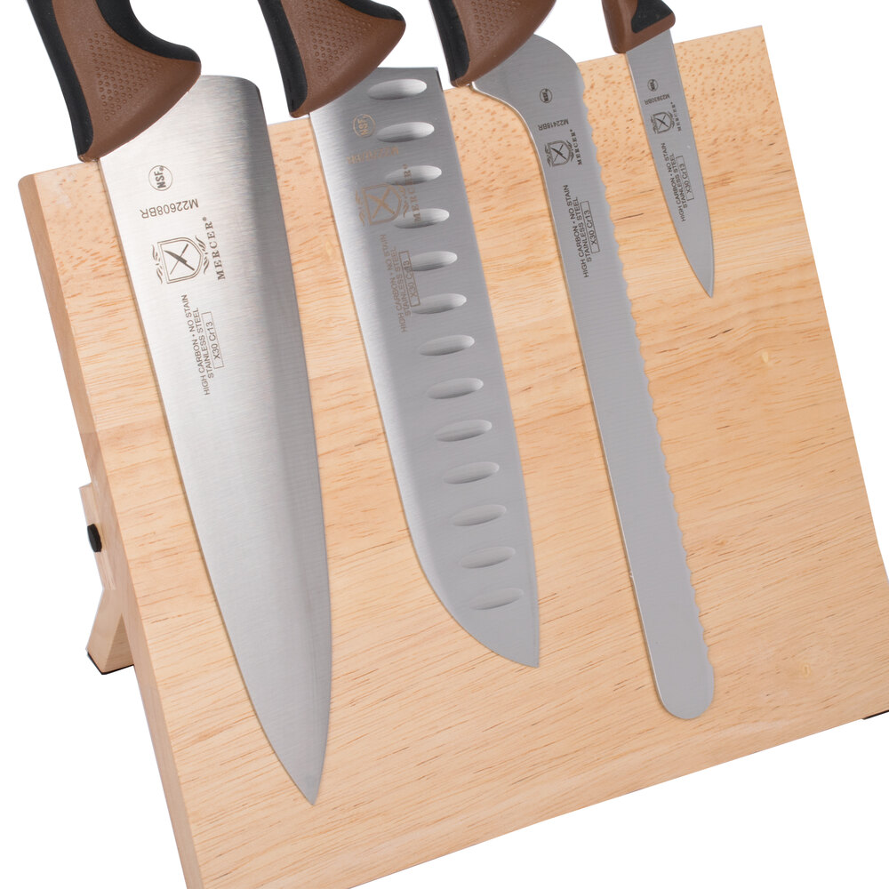 Keep your frequently-used knives within easy reach with this Mercer Culinary M21980BR Millennia® Colors® 5-piece rubberwood magnetic board and brown handle knife set!