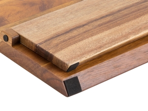 This acacia board features strong, hidden magnets that securely hold the knives in place, helping to maximize your drawer and counter space. This also makes for easy retrieval and storage of your frequently used knives to increase your productivity in the kitchen!
