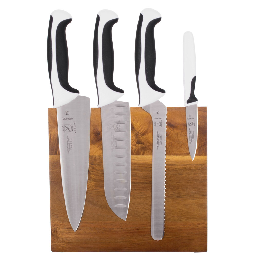 Mercer Culinary M21982WBH Millennia® 5-Piece Acacia Magnetic Board and White Handle Knife Set
