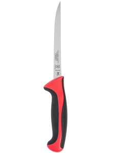 The mercer culinary millennia 6" semi-flexible narrow boning knife with red handle works great when prepping meat. It is sharp and easy to grip and comes highly recommended.