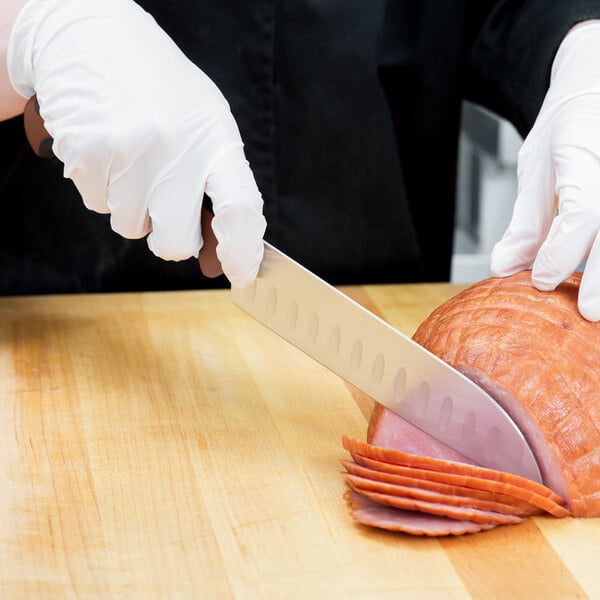 The granton edge on this knife features grooves that fill with fat and juices as you make each cut, allowing the product to separate from the knife edge quickly so you can make fast, clean slices. Use this all-purpose, versatile tool to cut meats and vegetables of all types.