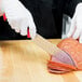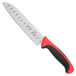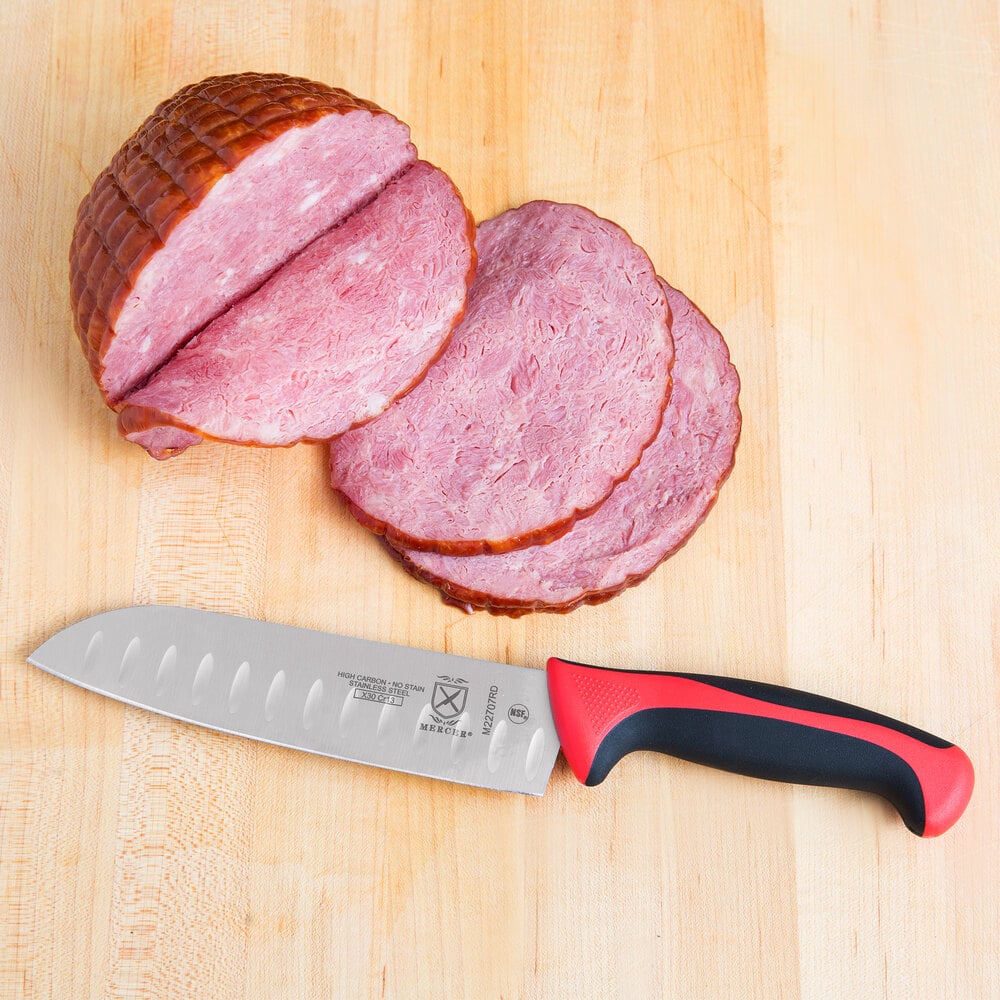 I've been using this santoku knife for some time now. I use it daily in the kitchen. It's thin just like the other millenia knives from mercer. It is easy to sharp but does not hold it's edge for long.