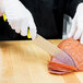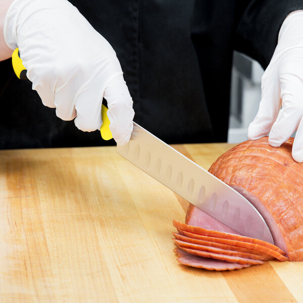 Since the handle is color-coded, you can pair this knife with other handle colors and create a simple system for preventing cross-contamination. Designate 1 type of food (vegetables, red meat, poultry, allergen-sensitive foods, etc.) for each handle type so that you never risk contaminating an order. The ergonomically designed handle is made of Santoprene for comfort and polypropylene for durability, while textured finger points and a protective finger guard provide slip-resistance and added safety.