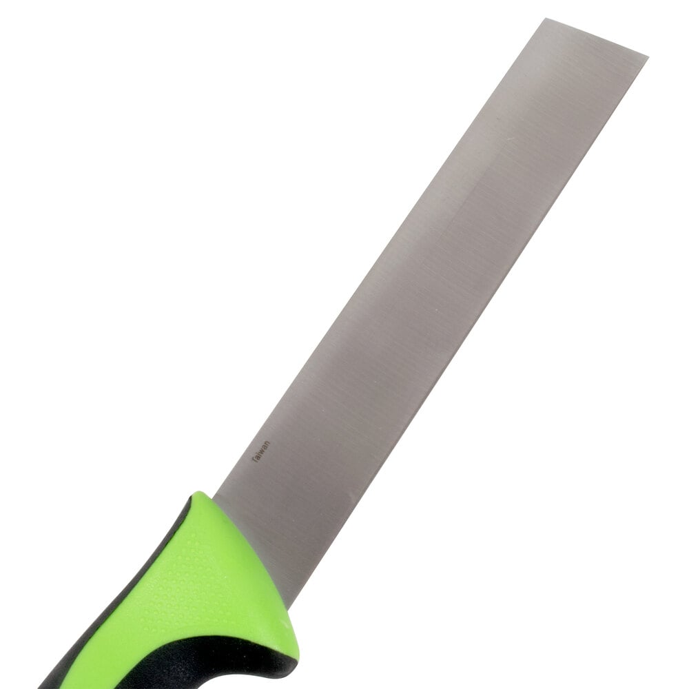 In addition to polypropylene for exceptional durability, the Santoprene that's also found in the handle is a high performance, soft material that offers a safe and comfortable non-slip grip for all day use. Furthermore, it will not break down when exposed to kitchen oils, and is able to withstand both extreme hot and cold temperatures. Textured finger points provide a non-slip grip, helping to minimize fatigue and improve safety. For additional peace of mind, this knife features a protective finger guard to keep your hands away from the blade while in use.