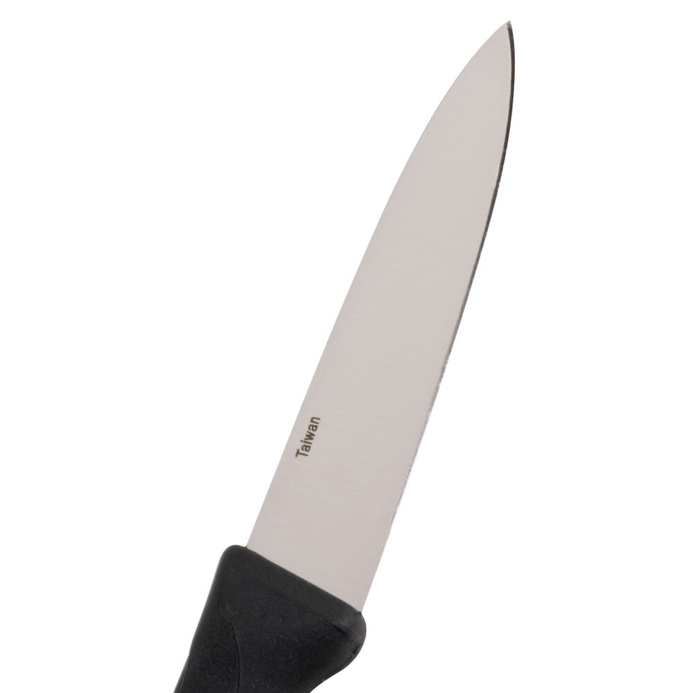 This knife's high carbon, stain-free steel blade effortlessly cuts through a variety of foods in your commercial kitchen. Its small, spear point allows the user to easily cut through thick crusts or skins.