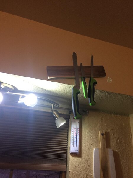 This mercy Yearwood knife holder magnetic knife board is fantastic it was very easy to hang up I simply put two screws in the wall if you don't know where the studs are it's OK because they give you an anchor and screws