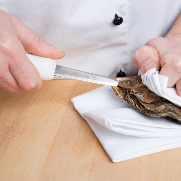 Offering superior strength and function, this Mercer Culinary M33028A 3" boston style oyster knife is sure to become an essential tool at any seafood venue. The long, narrow blade makes it extremely versatile and effective at opening any type of oyster.