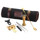 This cocktail kit includes a mixology roll to keep this kit together during transport, a jigger and bar spoon for mixing and stirring drinks, heavy-duty spring bar strainer, Precision Plus straight tong for adding ingredients to drinks, and black Y-peeler and channel knife for artfully crafting garnishes. Additionally, the strainer, jigger, and bar spoon have an elegant gold plated finish. To maintain their good looks, these tools should be hand washed.